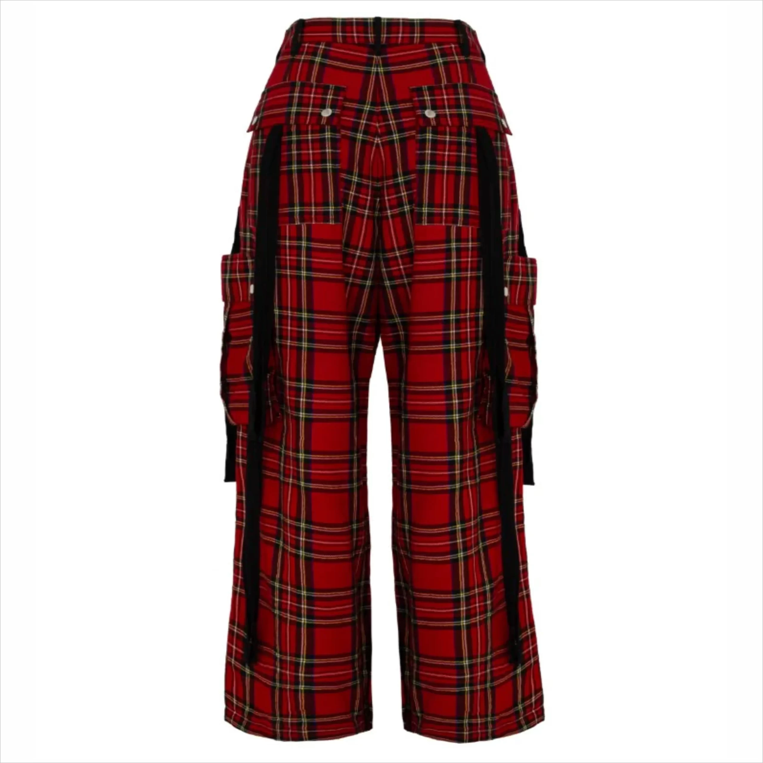 Show your tartan with The Trousers. These baggy style, red and black tartan trousers offer a grungy twist to your traditional trousers. These trousers are covered in pockets, with large cargo-style pockets at the side and patch pockets at the back, all studded with silver poppers for security. Contrasting black ribbons swing from the side of the legs and the back pockets for drama with every turn. If these trousers couldn’t get any more dramatic, pleats over the knees give even more volume to make these the ultimate statement trousers.